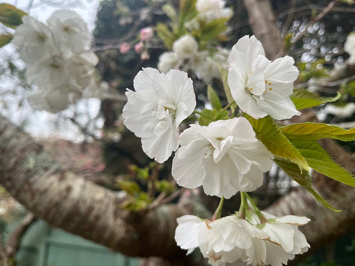 In anticipation of warmer weather which hasn’t yet arrived, I’ve had my nails painted (butter yellow, a mistake). Everything has burst into blossom, certainly, but the petals are being blown off the branches or pelted by rain. They’re hanging in wet and heavy clusters, looking sulky.