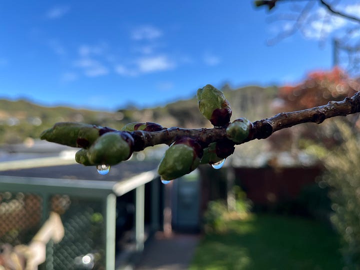 Each year I keep a record of the date our cherry tree begins flowering. Last spring it began on September 16. On the sixteenth this year I went out in sub-par conditions, reached up, and squeezed the buds. They were hard as nuts and dripped ice water.