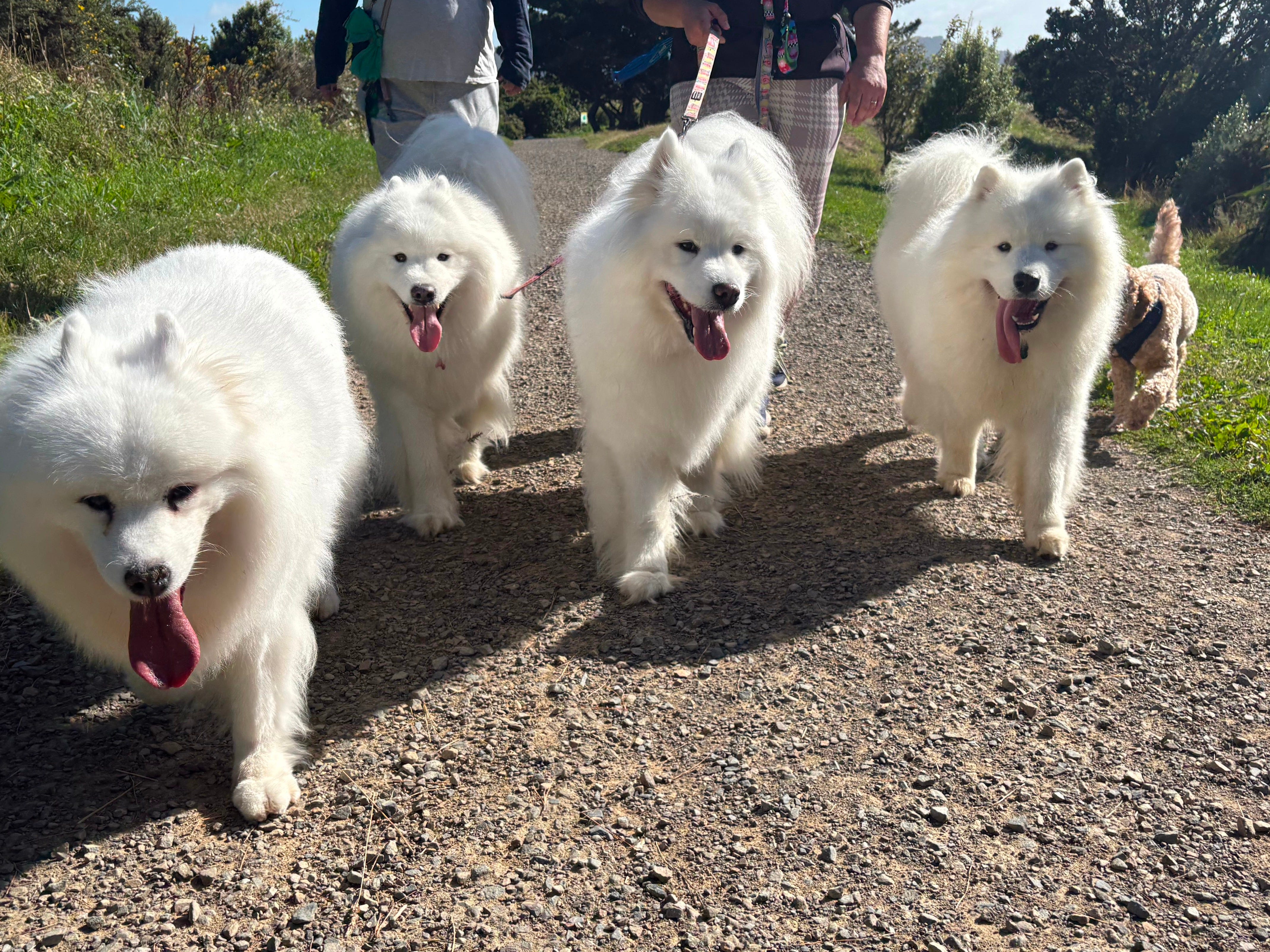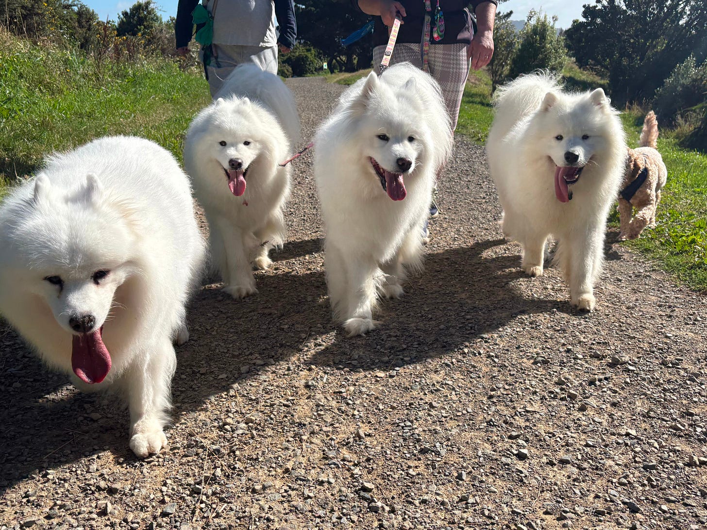 Walking the dog up on Te Ahumairangi Hill is the gift that keeps giving. Look at these rock stars, glaringly white in the late summer sunshine. We walked behind them for ages as they padded along on their lovable paws. Their upright tails swished from side to side, kind of like Vegas showgirls, and they were as fluffy as whipped marshmallows.
